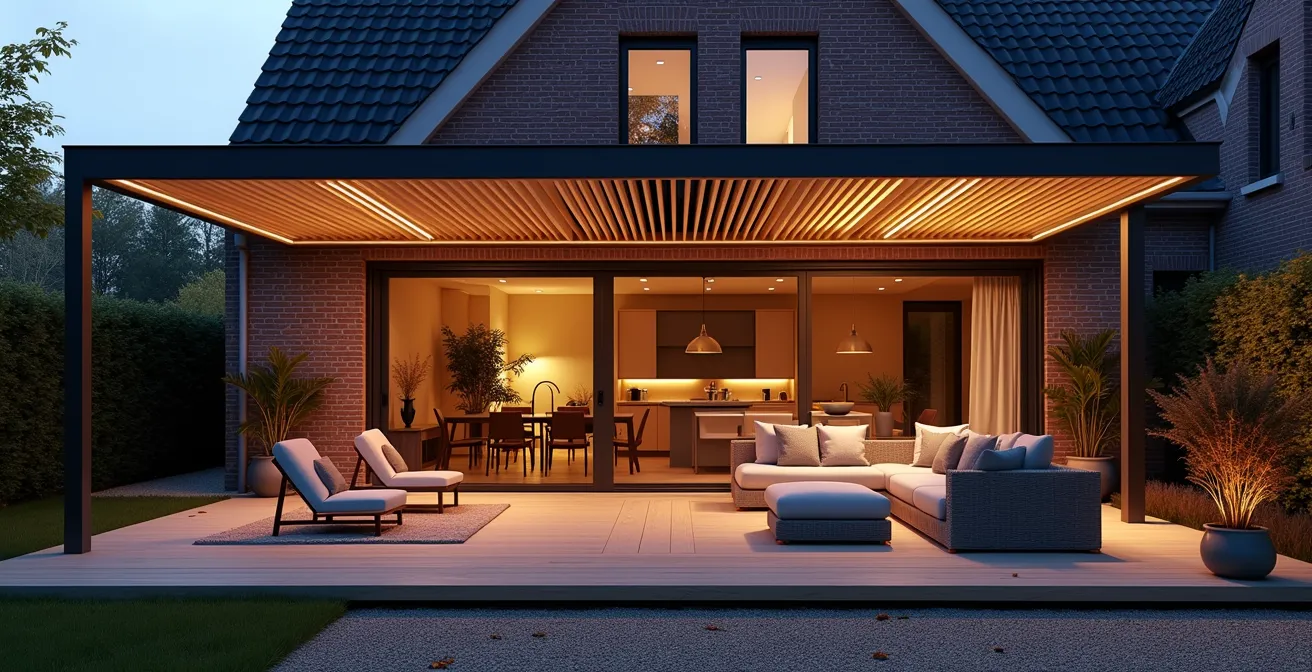 Une fois l’orientation définie, il faut penser à la « toiture » de votre pièce de vie. Pour une utilisation prolongée en Belgique, une protection fixe mais adaptable est indispensable. C’est ici que la pergola bioclimatique devient la pierre angulaire de votre projet. Bien plus qu’un simple toit, c’est un outil de gestion active des éléments. Son secret réside dans ses lames en aluminium orientables. En été, fermées, elles créent une ombre totale et protègent d’une averse soudaine. Inclinées, elles bloquent les rayons directs du soleil tout en laissant l’air circuler, créant une ventilation naturelle qui évite l’effet de serre.