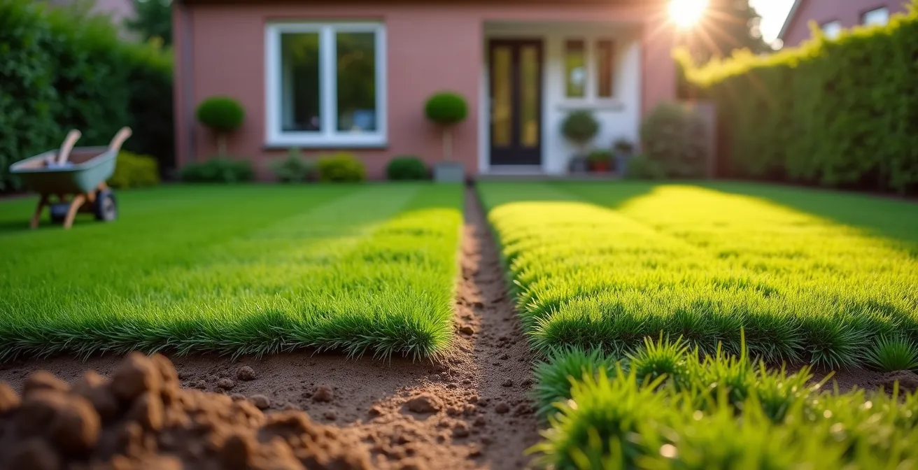 L’erreur la plus fréquente et la plus coûteuse que je constate est de considérer le gazon en rouleau comme un simple tapis que l’on déroule sur le sol existant. C’est l’équivalent de construire une maison sur des fondations instables. Un sol mal préparé, compacté et pauvre en nutriments, empêchera les racines de votre nouveau gazon de s’ancrer. Résultat : les jonctions entre les plaques ne se refermeront pas, l’herbe jaunira et mourra en quelques semaines. Vous aurez alors jeté votre argent par les fenêtres.