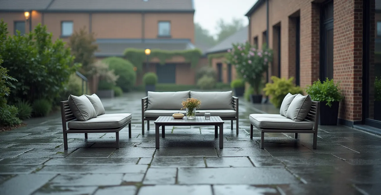 Pour tout propriétaire en Belgique qui rêve d’un salon de jardin toujours prêt à l’emploi, le défi est immense. Le marché est inondé de promesses « résistant aux intempéries », mais la réalité de nos 200 jours de pluie annuels raconte une autre histoire : celle de coussins gorgés d’eau, d’odeurs de moisi tenaces et de structures qui rouillent prématurément. Beaucoup pensent que la solution réside dans des housses de protection ou le choix de matériaux comme l’aluminium. Si ces éléments sont utiles, ils ne sont que la partie visible de l’iceberg. Le manque d’espace pour stocker le mobilier en hiver transforme ce qui devait être un plaisir en une contrainte logistique.